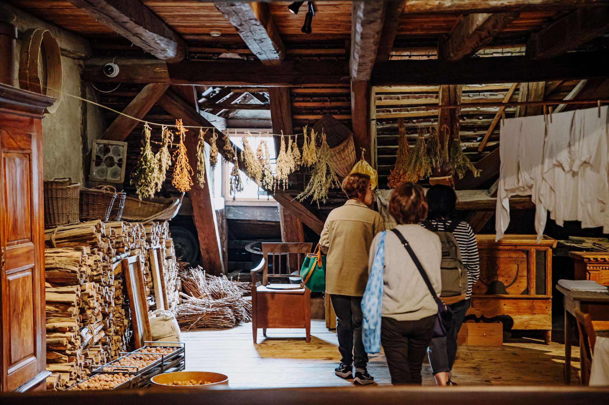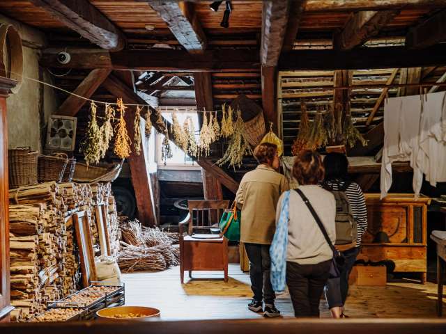 Im Hinterhaus befinden sich Ställe, Werkstatt, Getreidespeicher und die Schlafkammer des Knechts. Ein interaktives Spielzimmer lädt Kinder und Erwachsene ein, historische Kleidung anzuprobieren, Spiele zu entdecken und auf Strohmatratzen zu liegen.